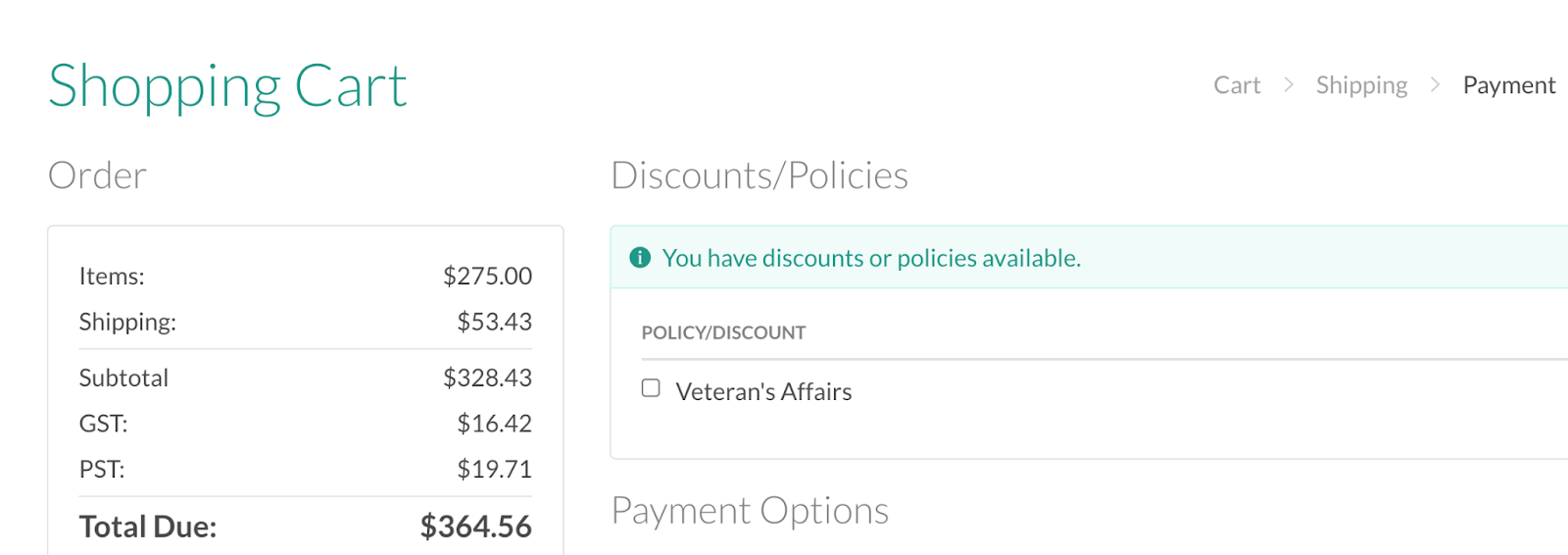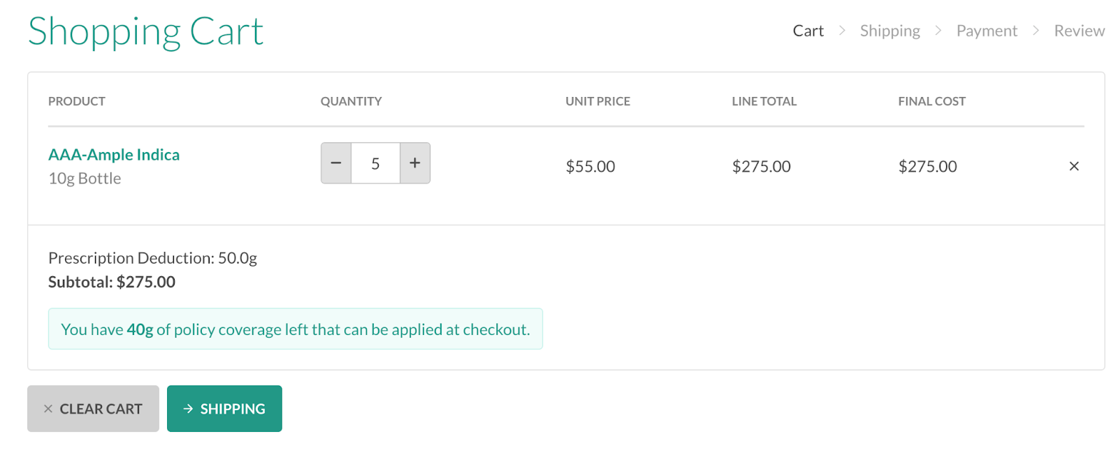 The remaining policy coverage is also shown on the Cart view. The amount available is adjusted when the product quantity is updated, or when the product is removed from the cart.