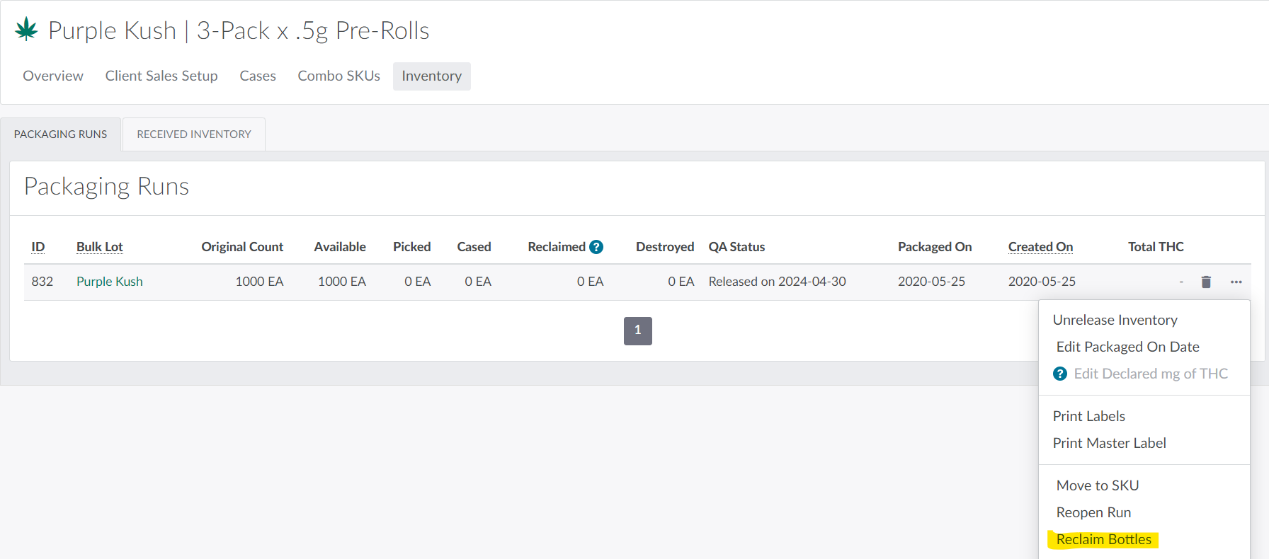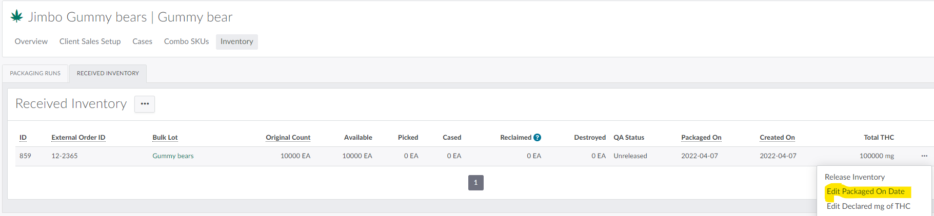 Found under a Product’s Inventory tab, select either Packaging Runs or Received Inventory. Users can edit the Packaged On date so that it matches the date on the barcode. 📅