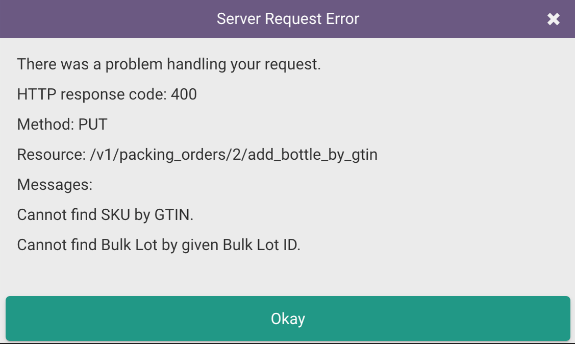 If you encounter this error, please review the initial three requirements (GTIN, Name, Packaged On) to ensure there are no typos or mistakes in the data setup.