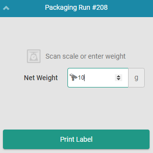 When packaging cannabis, Packaging Associates must weigh the cannabis as it's packaged into units on a physical scale. Once a weight is displayed, the associate can enter the weight manually or scan the scale's barcode to read the value. Depending on the facility's rules and regulations, the associate may be required to record tare weights before clearing the scale and weighing the cannabis.