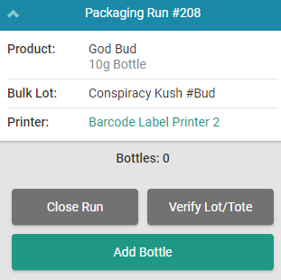 After adding enough bottles to satisfy the Packaging Run, the next step is to Close the Packaging Run. Once the cannabis has been packaged, visit the Products module to Pull a Bottling Record.