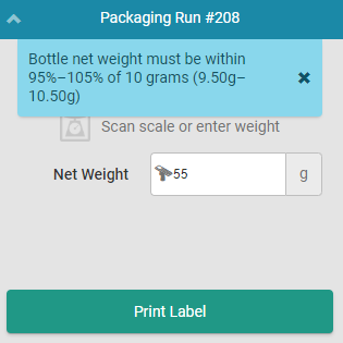 Note*: The Seed-to-Sale software displays variance warnings when the weight entered does not fall within the accepted range. This packaging tolerance varies depending on the product's subclass and the weight/volume of a single EA unit. If a variance warning appears, add or remove cannabis from the bottle and try again.*