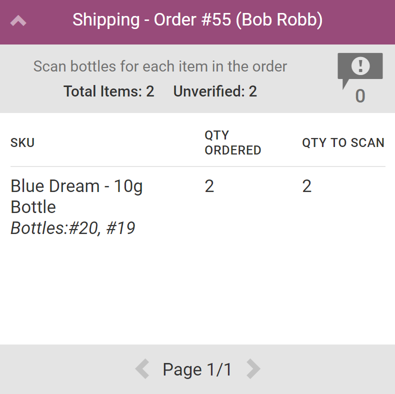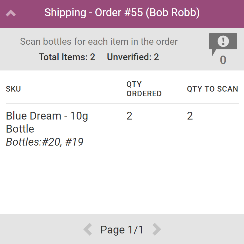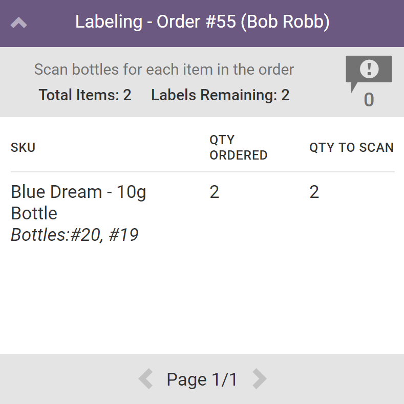 Scan a bottle of the appropriate SKU. This will add the bottle to the order and, at the same time, print the client's prescription label. Apply the label to the bottle, place the bottle in the shipping container, and click Done.