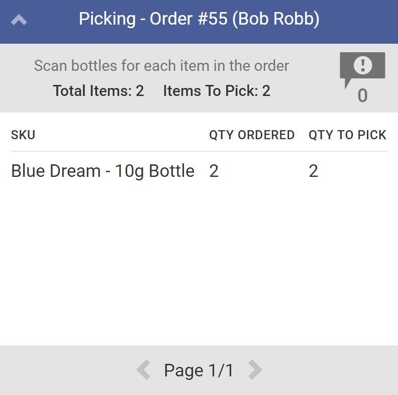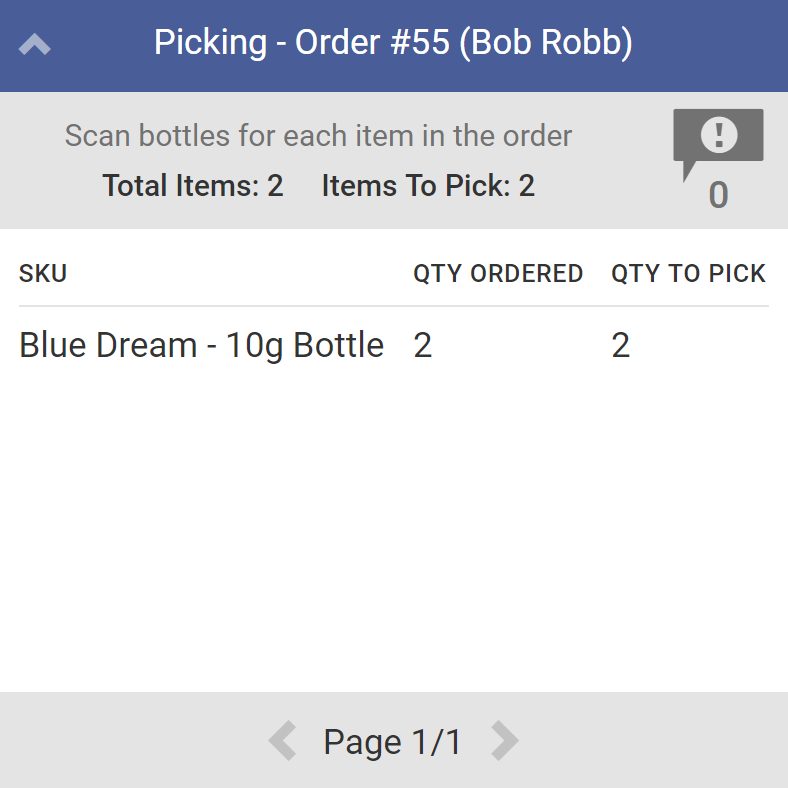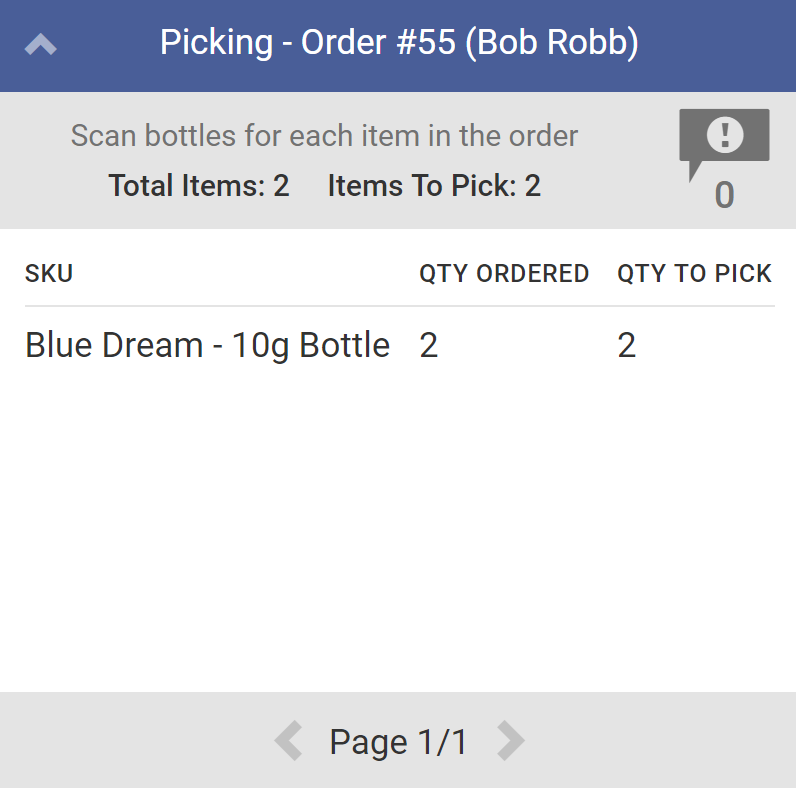 Choose an order (in the Picking stage) from the list, or scan the order's barcode to select it. This will open the order's Picking summary page. The Picking summary page displays the SKUs in the order, the quantity of each SKU requested, and the quantity to pick.