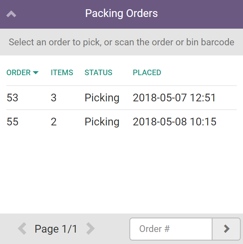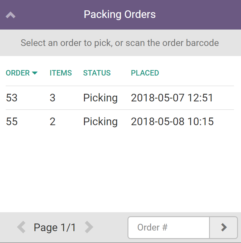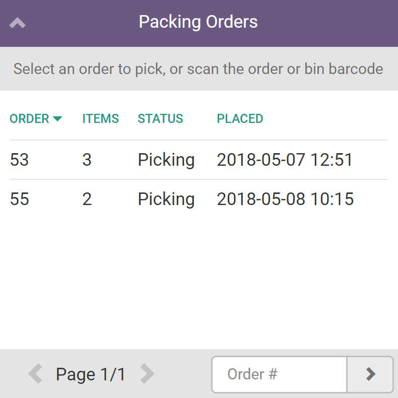 Choose an order from the list, or scan the order's barcode to select it. This opens the order's Picking summary page. The Picking summary page displays the SKUs in the order, the quantity of each SKU requested, and the quantity to pick.