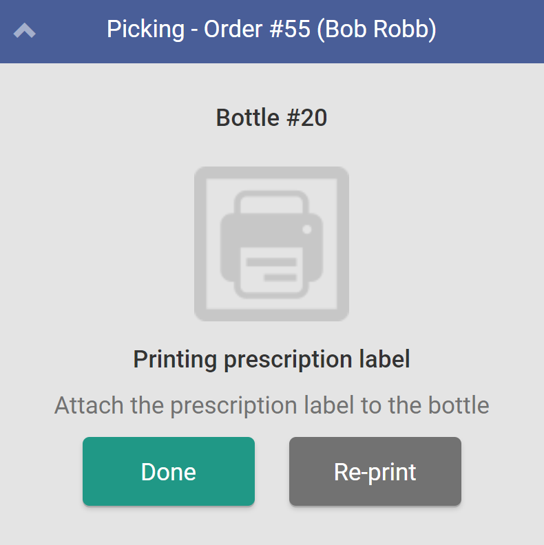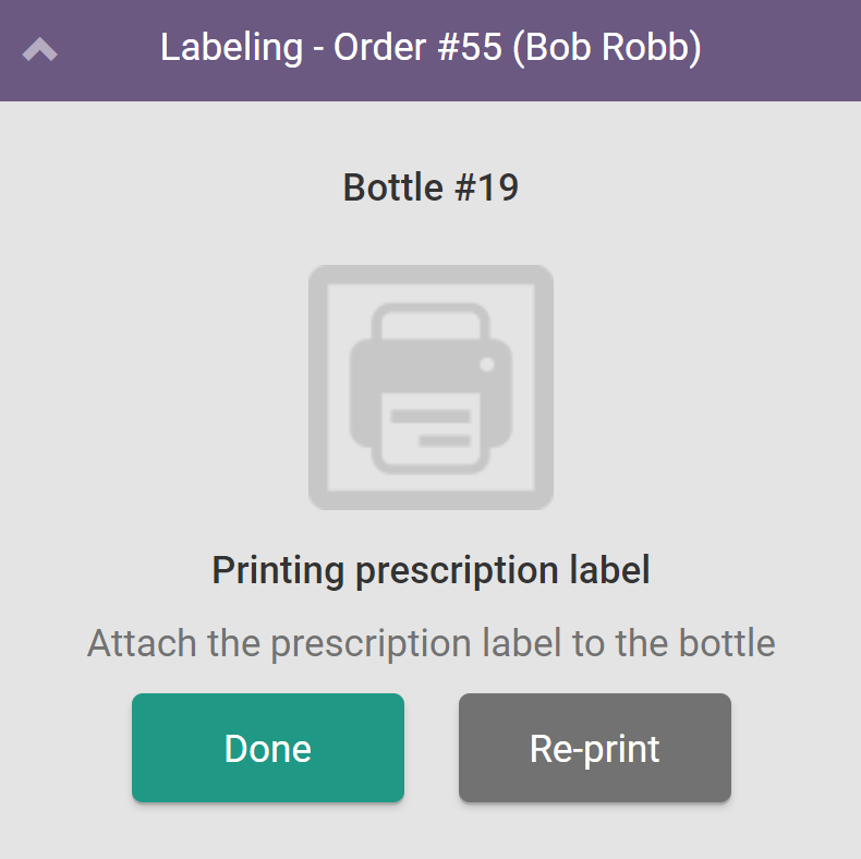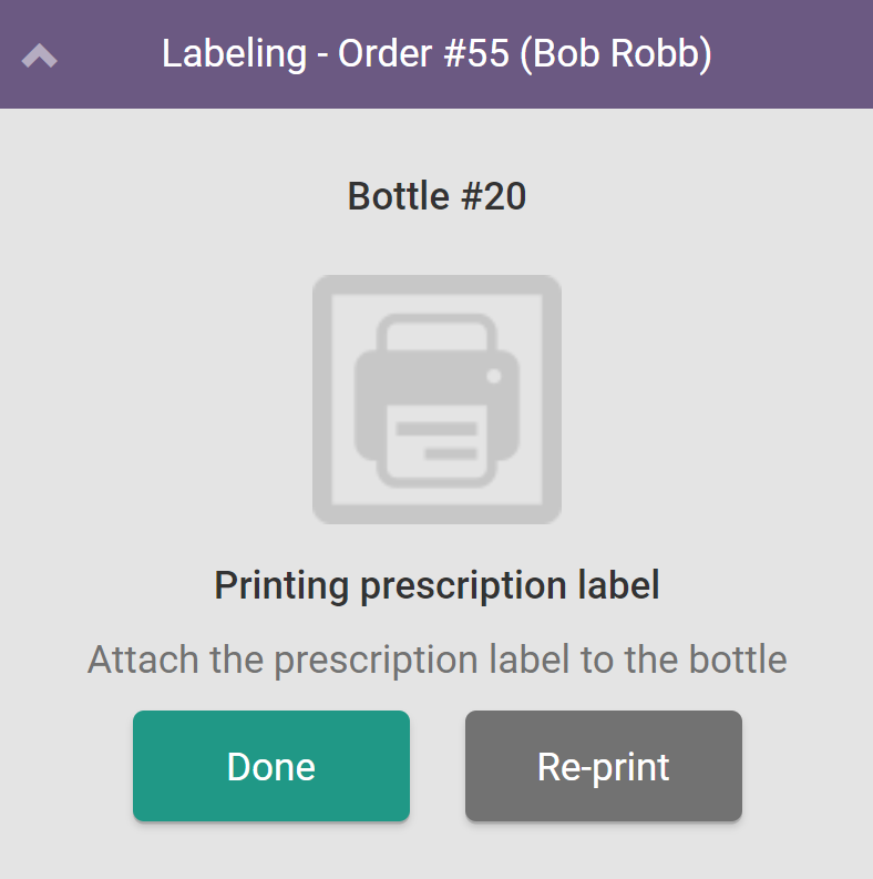 Scan a bottle to print the client's prescription label. Attach the label to the bottle and tap Done.Repeat this step until all bottles are labeled and the Scanner Gun indicates that the order labeling process is complete.