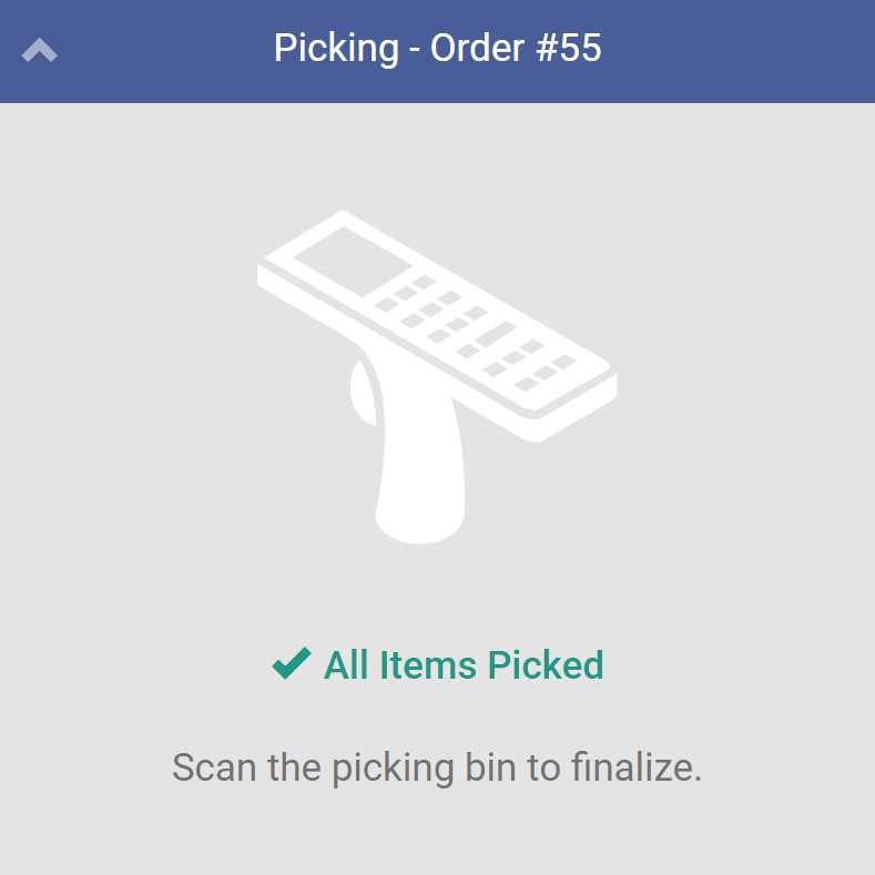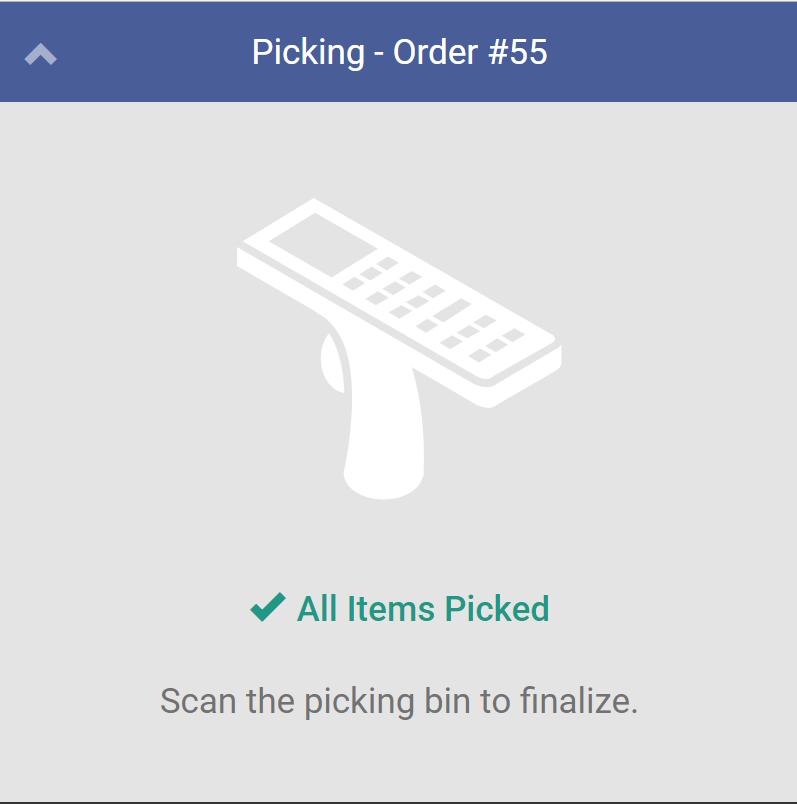 Scan the picking bin–the container that will temporarily store the order items as they're prepared for shipping. This completes the picking process.
