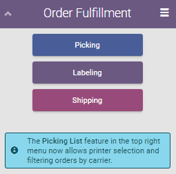 While these three tasks are essential, a Fulfillment Associate can Change the Picking Mode to customize the order fulfillment workflow to reflect the processes at their facility. Most picking modes combine 2-3 tasks into a single process, which may make sense if a single staff member fulfills multiple tasks at once.