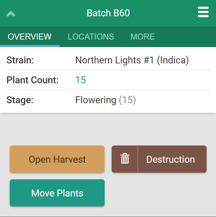 Note*: Only batches in the Flowering stage can be opened for harvesting. See How to Advance a Plant's Stage for instructions.*