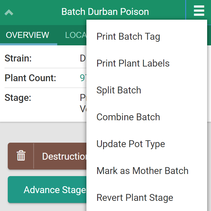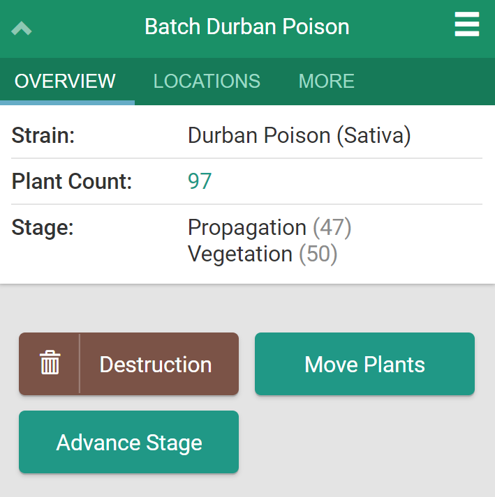 If an error occurs while advancing plants, a Grow Technician can revert plants to the previous stage from the batch's Overview tab on the Gun App.