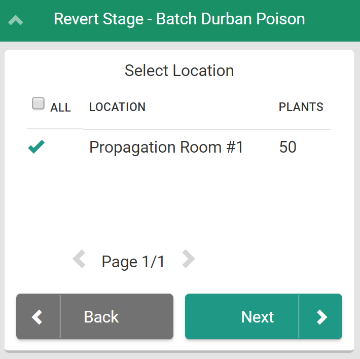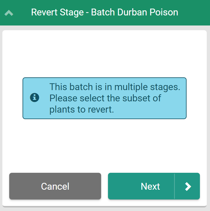 Select the stage(s) of plants to revert by clicking the corresponding buttons. This option only appears if the batch has plants in more than one stage. Once all desired stages are selected, click Next.