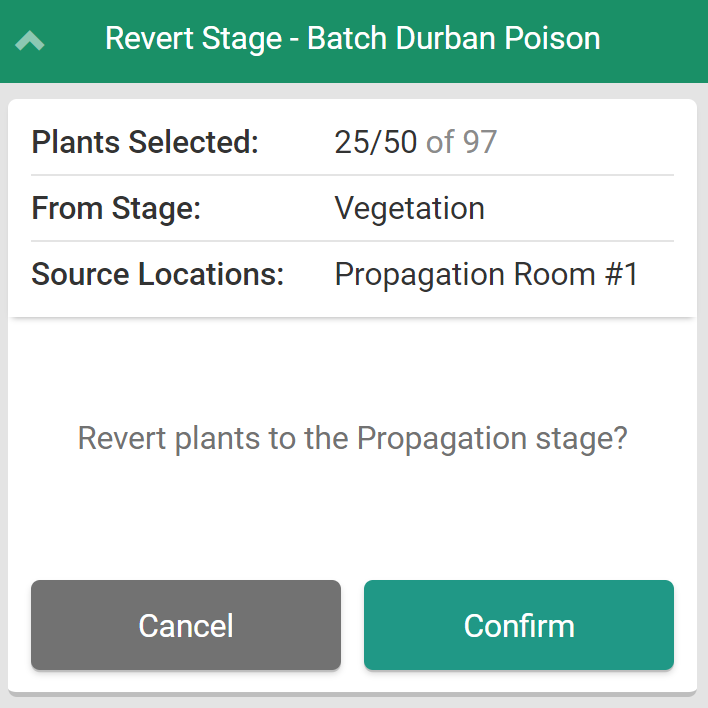 Read through the Revert Stage confirmation page. If everything is in order, click Confirm to revert the plants to the previous stage.