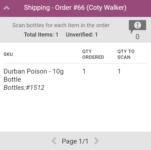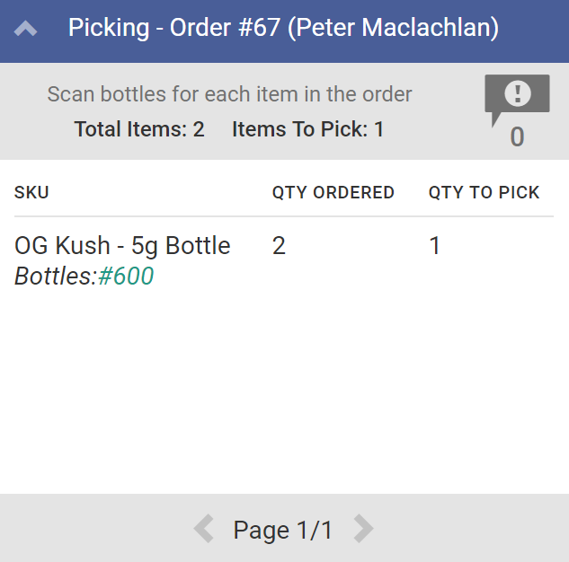 In the Picking stage, the Fulfillment Associate selects bottles of product to fulfill the order. By selecting or scanning an order in the Picking stage, the associate can see: