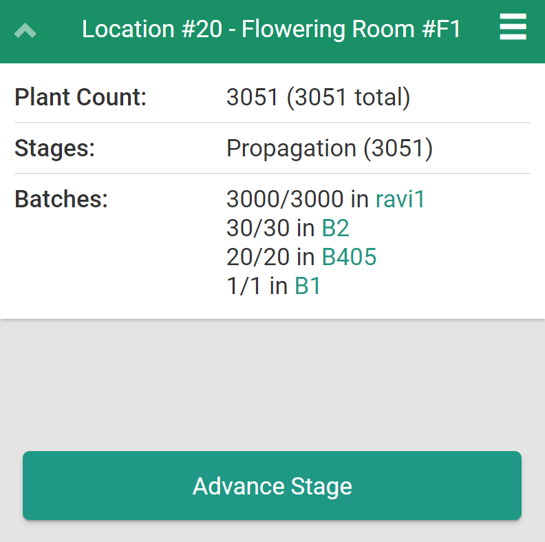 Click the Advance Stage button to Advance the Stage of All Plants in the Location. This is only possible if all plants in the location are at the same stage. You can also click on the name of a batch to view the Batch's Overview.