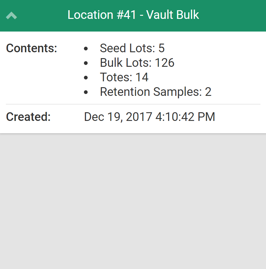 Access detailed information about a location by scanning the location's barcode, or by clicking a hyperlink to the location. There are two types of locations: Grow Rooms and Vault Locations/Picking Bins. Each location type has a different purpose and, when scanned, will display different information and actions.