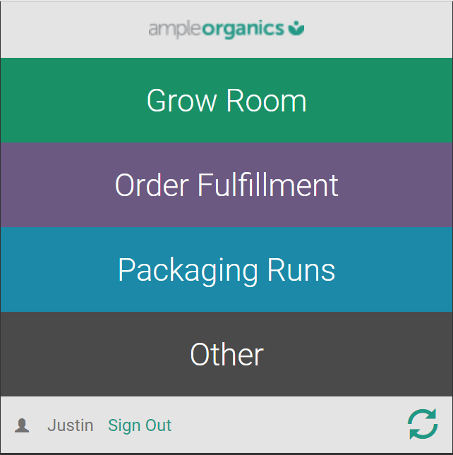 From the Gun App landing page, you can access the Grow Room, Order Fulfillment, Packaging Runs, and Other modules.