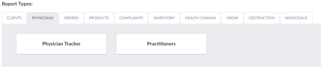 Click through the other tabs in the Report Types section to access Client Reports, Order Reports, Product Reports, Complaints Reports, Inventory Reports, Health Canada Reports, Grow Reports, Destruction Reports, and Wholesale Reports.