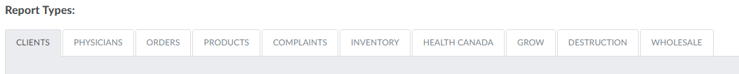 On the Reports tab, you can generate and download a diverse menu of custom reports in CSV format. Here, reports are categorized by Report Type: Clients, Physicians, Orders, Products, Complaints, Inventory, Health Canada, Grow Reports, Destruction,and Wholesale.