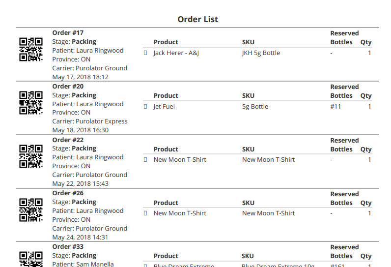 To expedite the order fulfillment process, Fulfillment Associates can generate a picking list for multiple orders and download it as a PDF. Each order on the list includes a summary of all products to be picked, the patient's province, and a QR code to allow the associate to access Order Fulfillment actions on the Gun App.