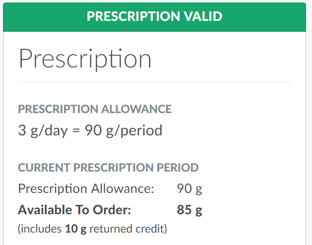 Please note that returned gram credits will only be available as long as the client's current prescription is valid. If the client does not use their returned gram credits before their prescription expires, the credit does not carry over to the next prescription.