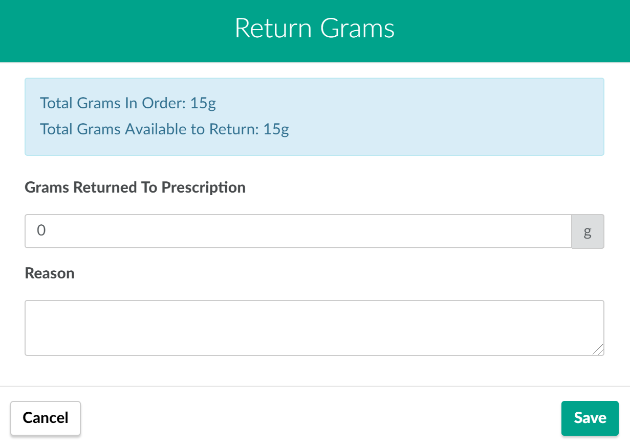 The user can enter the number of grams to return to a prescription and the reason for the return in the fields provided. The user cannot return more grams than were used in the order, nor can they return a negative amount.